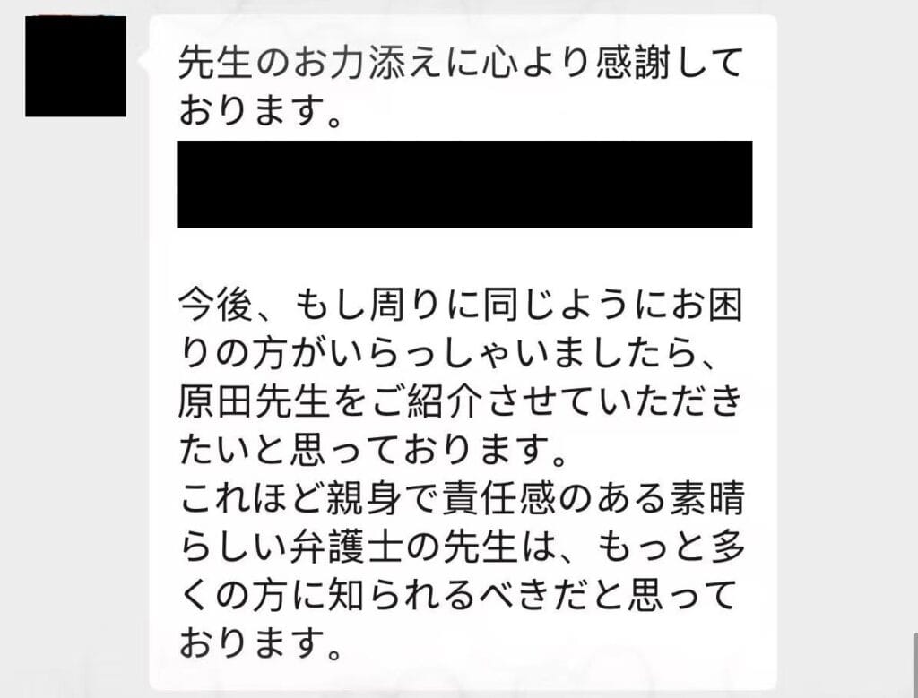 その一例として、事件終了時のご依頼者様からのメッセージを掲載します。